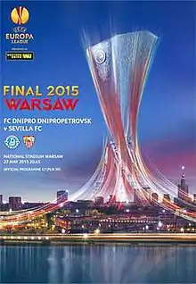 The 2015 UEFA Europa League Final was the final match of the 2014–15 UEFA Europa League, the 44th season of Europe's secondary club football tournament organised by UEFA, and the sixth season since it was renamed from the UEFA Cup to the UEFA Europa League. It was played at the National Stadium in Warsaw, Poland, on 27 May 2015,[5] between Ukrainian side Dnipro Dnipropetrovsk and the title holders, Spanish side Sevilla. Sevilla won the match 3–2 for a record fourth title.[6][7]