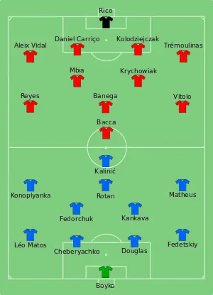 Although Sevilla dominated possession in the early exchanges, Dnipro opened the scoring after seven minutes when Nikola Kalinić headed in a cross from Matheus. In the 28th minute, Dnipro failed to clear from a free kick and Sevilla midfielder Grzegorz Krychowiak took possession of the ball, taking a step to evade Léo Matos before shooting an equaliser in his home country. Only three minutes later, the Spanish club took the lead, when captain José Antonio Reyes, in what was reported to be his final match for Sevilla, found Carlos Bacca who rounded Dnipro goalkeeper Denys Boyko. Only two minutes before half time, Dnipro equalised, with Ruslan Rotan dispatching a free kick past Sergio Rico.[23]