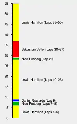 Vettel passed Räikkönen, Ricciardo and Verstappen and was less than a second behind Rosberg by lap 50. Hamilton's actions also allowed Verstappen who was 3.5 seconds away from Rosberg to be 1 second behind Vettel by this time.