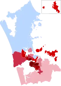 | Whau | Whau | 11,567 | 61.85 | 3,054 | 16.33 | 1,361 | 7.28 | 911 | 4.87 | 1,809 | 9.67 | 18,702 | |