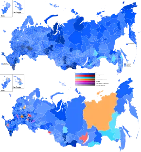 United Russia won a supermajority of seats, allowing them to change the Constitution without the votes of other parties. Turnout was reported as low. Throughout the day there were reports of voting fraud including video purporting to show officials stuffing ballot boxes.[47] Additionally, results in many regions demonstrate that United Russia on many poll stations got anomalously close results, such as 62.2% in more than hundred poll stations in Saratov Oblast, suggesting that the results in these regions likely have been rigged.[48] The government said there was no evidence of any large scale cheating.[49] On 22 September, the Central Electoral Committee canceled the results in seven constituencies, where the number of used ballots exceeded the number of registered voters, or where the authorities were videotaped stuffing the ballots.[50] According to research by University of Michigan political scientists Kirill Kalinin and Walter R. Mebane Jr., the election results are fraudulent.[51]