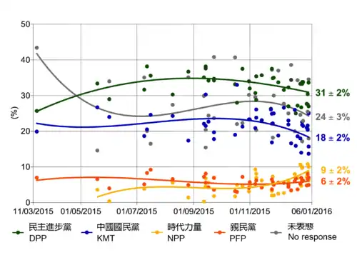 | TVBS Archived 6 November 2015 at the Wayback Machine | 19 October 2015 | 30% | 30% | – | 1% | – | 1% | – | – | – | 2% | 1% | 35% | Tied |