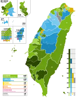 | Keelung City | Hsieh Kuo-liang (KMT) | Cai Shi-ying (DPP) 41.45% | Hau Lung-bin (KMT) 36.14% | DPP gain. | ||||