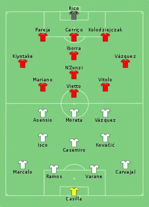 Real Madrid's starters of the 2016 Champions League Final Toni Kroos, Gareth Bale and Cristiano Ronaldo missed the match with injuries.[13][14] In the 21st minute Marco Asensio scored the opening goal for Real Madrid with a strike from 25-yards out which flew into the top left corner of the net. Franco Vázquez got the equalizer in the 41st minute when he scored with a low left foot shot from just inside the penalty area.[15] Sevilla were awarded a penalty in the 72nd minute when Sergio Ramos was adjudged to have fouled Vitolo by flicking back his leg inside the penalty area. Yevhen Konoplyanka scored from the resulting penalty with a low shot to his left sending the goalkeeper the wrong way. In the 93rd minute Sergio Ramos scored with a free header from two yards out after a cross from Lucas Vázquez on the right.[16] Four minutes into extra-time Timothée Kolodziejczak was sent off for a second yellow card following a foul on Lucas Vázquez. Sergio Ramos then stooped low to score his second goal but the goal was ruled out for a pull on Sevilla defender Adil Rami. In the 119th minute Dani Carvajal got into the penalty box after a long run down the right and scored when he lifted the ball with the outside of his right foot over the goalkeeper.[17]