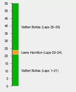 After the front-runners all made a good start, positions at the front of the field did not change from the start grid into the opening laps. Mercedes driver Bottas retained first place from pole position. Hamilton followed Bottas closely, able to challenge for position at times. Hamilton later congratulated Bottas on his dominant performance, saying the former 'gave it everything, every single lap'.[11] Bottas said that he had been "managing the pace and that way the race", and "it was a nice feeling, a really nice feeling",[11] suggested he could have pushed harder. Indeed, Bottas set the fastest lap of the race in the closing stages.