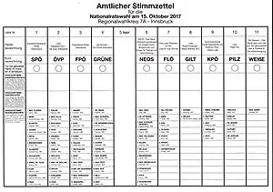 In addition to the parties already represented in the National Council (except Team Stronach, which dissolved in August and did not contest the election), eleven parties collected enough signatures to be placed on the ballot. Five of these were cleared to be on the ballot in all states, six of them only in some.[21]