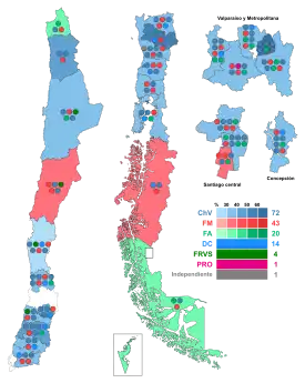 Following an election reform in 2015, the Chamber of Deputies grew in size to 155 members from the previous 120, while the Senate increased its membership from 38 to 43 after this election, and will grow to 50 following the election in 2021.[1] Multi-seat constituencies were reestablished, replacing the previous binomial system of two seats per district, installed by the outgoing Pinochet dictatorship in 1989.[2][3] For the first time, a 40% gender quota was put in place for candidates of each political party in parliamentary elections.[4]