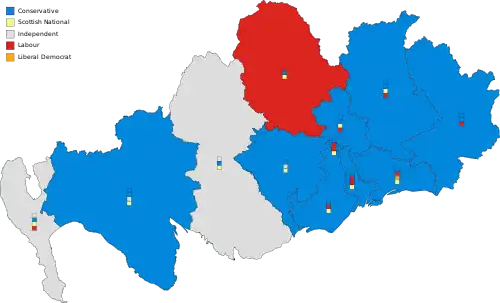 - †††On 12 April 2019, Castle Douglas and Crocketford Conservative Cllr David James resigned from the party and became an Independent claiming the party avoided making policies.[5]