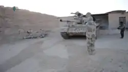 On 7 May, the Syrian Arab Army launched an attack on the FSA, in the Badiya region of the southeastern countryside of Damascus,[52] advancing some 45 kilometers along the Baghdad-Damascus highway towards the Iraqi border.[53] On 18 May, a mechanized convoy of SAA soldiers and Iraqi Shi'ite militiamen was struck by several U.S. airstrikes northwest of the Zarqa Junction, destroying 5 tanks and a 1 Shilka, as well as killing 8-12 Iraqi militiamen. The advance along the Damascus-Baghdad Highway was halted.