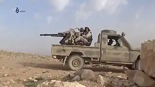 Rebel factions attacked ISIL on 18 and 19 March near al-Badia and captured several areas, including a former Scientific Research Battalion base.[23][24][11] They captured several areas including the strategic Mount Naqab on 20 March.[25][26][27] By 21 March, the rebels had captured more than 25 square kilometres of territory in the eastern Qalamoun and more than 1,800 square kilometres overall since the start of the campaign. ISIL forces were routed from the majority of eastern Qalamoun.[13][27] Ahrar al-Sham announced that its fighters had captured al-Afai mountain range.[28]
