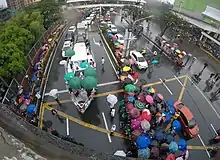 The traditional Parade of Stars which featured floats of the film festival's eight entries took place in Parañaque on December 23, 2018 and was planned to traverse a route measuring 12.3 km (7.6 mi).[7] The parade began near Shopwise Santana Grove in Sucat, where an estimated crowd of 300,000 waited for the start of the event,[7] and ended on Bradco Avenue. The parade route also included Dr. A. Santos Avenue, V. Medina Avenue, Quirino Avenue, NAIA Road, and Macapagal Boulevard. The Parañaque Traffic and Parking Management Office closed a significant portion of Dr. A. Santos Avenue starting from Sta. Rita Avenue from vehicular traffic beginning of noon of the day of the parade with assembly and preparation of the event scheduled to begin at 1pm.[5] The normally eastbound lanes of Dr. A. Santos Avenue from Soreena to Kabihasnan, eastbound lanes of NAIA Road from Quirino Avenue to Macapagal Boulevard, and southbound lanes of Macapagal Boulevard from NAIA Road to Bradco Avenue were also temporarily opened for counterflow in an effort to manage anticipated heavy traffic situation caused by the parade.[6]