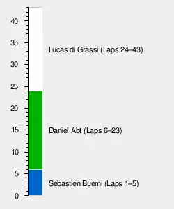 That same lap, Lotterer overtook Bird for tenth driving into the turn eleven chicane. Lotterer then delayed Bird enough to allow Vergne to draw closer.[41] Vergne got ahead of Lynn around the outside on the approach to the turn 11 chicane on lap 13.[41] Di Grassi lapped faster than anybody and he overtook Dillmann on the outside for third into the same corner two laps later.[41][48] Lotterer moved marginally farther away from Bird to provide his teammate Vergne with an opportunity to pass. This came on lap 16 as Vergne passed Bird on the inside into turn six for tenth.[48] On lap 17, Lotterer passed Engel for eighth.[45] A lap later, Heidfeld overtook Prost on the back straight to move into sixth.[41] Di Grassi caught and passed Buemi into turn six for second on the 20th lap.[44] Prost lost seventh to Lotterer on the next lap.[45] In the meantime, Bird returned to the top ten by passing Engel on the main straight.[41] At the end of lap 22, the field except for Sarrazin made their mandatory pit stops to change into a second car.[44] Rosenqvist stopped in the pit lane's center to avoid colliding with his teammate Heidfeld; drivers scrambled for space to avoid hitting him.[48][49][n 1]