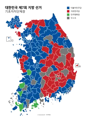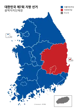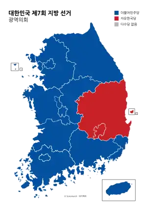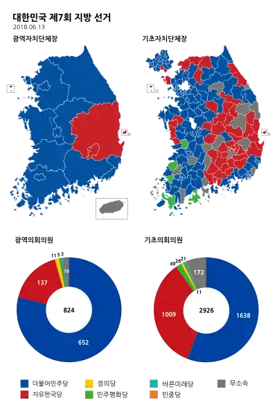 The 7th local elections were held in South Korea on 13 June 2018. The election coincided with the by-elections for the vacant seats in the National Assembly.[1] The election was a landslide victory for the Democratic Party of Korea, the ruling party, after two successful summits with the third inter-Korean summit on 27 April and the first North Korea-United States summit in Singapore on 12 June.[2]