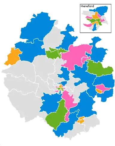 The election resulted in the Conservative Party losing its majority on the council for the first time since 2007, winning 13 seats. Independents made gains and became the largest group on the council after winning 18 seats, 9 seats short of a majority. The Liberal Democrats and Greens also made gains at the expense of the Conservatives, winning 7 seats each.[2][3] Two non-party groupings, the 'Herefordshire Independents' (comprising 12 of the 18 Independents elected) and the localist It's Our County, formed a coalition with the Greens to govern the council.