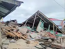 Preliminary assessment conducted by the government of North Maluku showed that more than 980 structures had either been heavily damaged or destroyed.[18] Many houses located near the epicentre had been heavily damaged by the quake. In Yomen Village in Joronga Island, one of the hardest hit areas, all of the residents' 164 houses and a mosque were flattened by the quake, forcing its 686 residents to evacuate to the mountain.[19] As many as 19 elementary schools and 7 junior high schools were damaged. Widespread damage were reported across 21 villages and 5 districts in South Halmahera.[20] At least 110 public facilities were damaged, 78 of which were heavily damaged.[21] Updated reports on the damage assessment revealed that more than 2,700 houses had been damaged or destroyed by the quake, of which 1,500 homes suffered slight damage while the other 1,200 suffered heavy damage.[10][22]