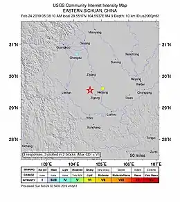 According to the China Seismological Network, the epicentre of the earthquake was located in Rong County, Zigong City, Sichuan Province, China (29.48°N, 104.49°E), with a magnitude of Ms 4.9, a depth of about 5 km, and a maximum intensity of VI degrees.[2][3] The U.S. Geological Survey and the European Mediterranean Seismological Center (EMEC) determined the same numerical magnitude as that of China, both at mb 4.9, while both measured a source depth of about 10 km.[10][11] The lower magnitudes measured by the GEOFON standard station network of the German Research Centre for Geosciences, for MB 4.8 level.[12] In addition, based on seismic reports collected by the online Internet seismic survey, the USGS, the maximum intensity of this earthquake was presumed to be VI on February 24, 2019. And after 2 days, the agency revised the intensity presumed by this method to IV.[13]