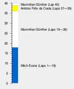 Maximilian Günther scored his first ever Formula E race victory, becoming the youngest ever Formula E race winner, after triumphing in a last lap battle with António Félix da Costa. Polesitter Mitch Evans came in 3rd for Panasonic Jaguar Racing, benefitting from a penalty issued to Nyck de Vries, who had come in third on the road. De Vries lost his maiden podium, due to an infringement of the minimum battery coolant temperature.[15] This penalty also bumped Pascal Wehrlein to fourth overall in the pecking order.