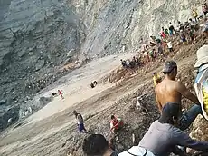 Dozens of miners have been killed in recent years as a result of smaller accidents, with "jade pickers" who scavenge tailings from larger operators being at greater risk.[9] These freelance miners live at the base of huge mounds of rubble that has been excavated by heavy machinery.[11] The pickers are usually migrants from other regions of Myanmar and are unregistered, which makes identification of the missing people difficult.[11] Hundreds of miners scavenge through tailings dumped by trucks at the site. The tailings are piled high forming steep and high slopes, in a moonscape of no vegetation, which is likely to collapse.[4]