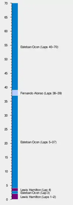 On the restart, only race leader Hamilton started from the grid on intermediate tyres; the rest of the grid started from the pits having changed to slick tyres. Hamilton pitted after the fourth lap, putting the Alpine of Ocon into the lead with Vettel chasing close behind. Hamilton made a pit stop for hard tyres on the nineteenth lap, allowing him to undercut Verstappen and Ricciardo when they stopped the following lap.[29][30] Sainz undercut Latifi and Tsunoda, putting him into third behind Ocon and Vettel. Verstappen overtook Räikkönen to move up into eleventh place.[22] Vettel and Ocon made pit stops for new tyres on the thirty-sixth and thirty-seventh laps, respectively.[31] Hamilton fought his way up to fourth, then pitted on the forty-eighth lap, coming out behind Alonso. Alonso held him back for twelve laps after the fifty-third lap until the Spaniard locked up and Hamilton passed at the first turn. Hamilton overtook the Ferrari of Sainz on the sixty-seventh lap and moved into third.[30] Gasly pitted on the sixty-eighth lap for fresh tyres and got the fastest lap on the last lap of the race. Ocon won the race from Vettel and Hamilton.
