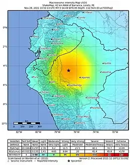 A major earthquake struck northern Peru on November 28, 2021, 5:52 a.m. local time with a magnitude of 7.5 on the moment magnitude scale between the Amazonas and Loreto departments of Peru.[3] A maximum Modified Mercalli intensity (MMI) of VII (Very Strong) was reported in the town of Santa Maria de Nieva according to the Geological Institute of Peru.[4][3]