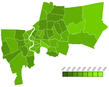 ![]() Gubernatorial election results map. Shades of green denote the percentage points of votes Chadchart gained in each district. | ||||||||||||||||||||||||||||||||||||||||