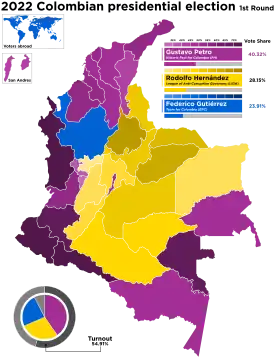 Presidential elections were held in Colombia on 29 May 2022, with a runoff on 19 June 2022 as no candidate obtained at least 50% in the first round of voting. Iván Duque, who was elected president in 2018, was ineligible to run due to term limits.[1] Gustavo Petro, a senator, former Mayor of Bogota, and runner-up in the 2018 election, defeated Rodolfo Hernández Suárez, former Mayor of Bucaramanga, in the runoff election.[2] Petro's victory made him the first left-wing candidate to be elected president of Colombia,[3][4] and his running mate, Francia Márquez, is the first Afro-Colombian elected to the vice-presidency,[5] as well as the second female vice-president overall.[6]