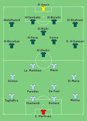 Argentina took the lead in the 10th minute with a penalty from Lionel Messi, awarded for a foul on Leandro Paredes, which he rolled into the left corner. Argentina would have three further goals ruled out for marginal offsides. Saudi Arabia equalized in the 48th minute with a low shot to the right corner from Saleh Al-Shehri.[6] They took the lead five minutes later when Salem Al-Dawsari curled the ball into the right corner of the net from just inside the penalty area.[7]