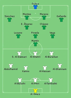 After a goalless first half, Mexico struck twice in the second half, first with a volley from a corner by Henry Martín in the 47th minute, and then with a thunderous free kick by Luis Chávez in the 52nd minute. However, Mexico failed to find a third goal, which they needed to overtake Poland on goal difference; Mexico had received more yellow cards than Poland and would have been eliminated on this basis if the teams finished level on points, goal difference, and goals scored. Salem Al-Dawsari, however, would score for Saudi Arabia in the fifth minute of added time with a goal after a one-two, confirming both teams' elimination as Mexico claimed the 2–1 win.[29]