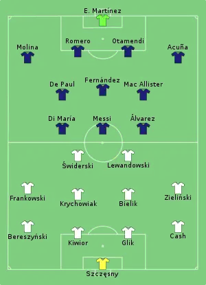 Polish goalkeeper Wojciech Szczęsny made a penalty save in the first half to deny Lionel Messi, only to concede twice for the first time in this FIFA World Cup, when Argentina scored two goals in the second half; the first goal came from Alexis Mac Allister with a low shot to the left corner, and the second from Julián Álvarez with a shot to the top right corner as the Argentines won 2–0, topping the group with six points.[26]