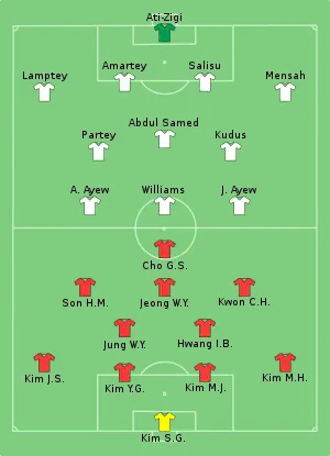 In the first half, Ghana scored two goals against the run of play within a ten-minute span to take a 2–0 lead, coming from Mohammed Salisu and Mohammed Kudus. South Korea would then reply in the second half with two goals of their own, both headers scored within three minutes of each other by Cho Gue-sung, to level the game at 2–2. Kudus scored the decisive goal and his second of the match in the 68th minute, coming after Iñaki Williams had mistimed his initial shot, to put Ghana back in front. Ghanaian goalkeeper Lawrence Ati-Zigi made multiple crucial saves and Salisu cleared an effort off the line late on to secure them a 3–2 victory.[8]