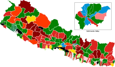 The 275 members of the legislature are elected by two methods; 165 are elected from single-member constituencies by first-past-the-post voting and 110 seats are elected by closed list proportional representation from a single nationwide constituency.[29] Voters receive separate ballot papers for the two methods. A party or electoral alliance has to pass the election threshold of 3% of the overall valid vote to be allocated a seat in the proportional vote.[30] Nepal uses the Sainte-Laguë method to allocate proportional seats.[31]