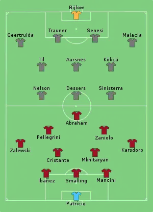 - ↑ Roma assistant manager Salvatore Foti was shown a yellow card (59').