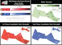 ![]() Map showing the winning candidate's vote strength in each of the 10 wards and their respective polling districts. The districts shaded in Blue voted a majority for Drew Dilkens, and Yellow voted a majority for Chris Holt. The darker the shade, the higher the candidate's total vote share in that specific polling district.