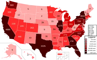 The 2022–2023 mpox outbreak in the United States is part of the larger outbreak of human mpox caused by the West African clade of the monkeypox virus. The United States was the fourth country outside of the African countries with endemic mpox, to experience an outbreak in 2022. The first case was documented in Boston, Massachusetts, on May 17, 2022.[3] As of August 22, mpox has spread to all 50 states in the United States, as well as Washington, D.C., and Puerto Rico.[4] The United States has the highest number of mpox cases in the world. California has the highest number of mpox cases in the United States.