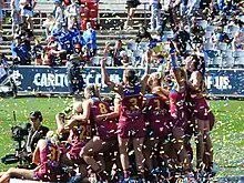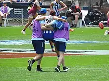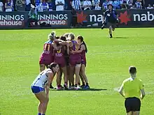 Brisbane wing Sophie Conway was given a head injury assessment at three-quarter time but returned to the field mid-way through the final quarter.[19] A jerry can was displayed to let the team know that a major effort was now required.[2] Dakota Davidson had been quiet, perhaps due to her knee injury, which clearly had not fully healed, but now managed to soar above a pack and take a strong contested mark. She then scored a goal to peg the margin back to a single point. A few minutes later, she did it again, putting Brisbane back in front. Then Ellie Hampson was awarded a free kick for a hold in the goal square and slotted another goal.[13][14] North Melbourne's efforts were stymied by ferocious tackling effort, with Brisbane laying on another 64 tackles in the second half to finish with 110 for the match, an AFLW record, and keep North Melbourne scoreless in the final quarter. Belle Dawes finished with 18 contested possessions, 20 touches and 13 tackles, and Ally Anderson had 20 disposals and six clearances.[19] Finally, with four minutes remaining, Bre Koenen, who had been a lion in defence in more ways than one, came forward to kick a goal and put the result beyond doubt. Brisbane claimed its second AFLW premiership, winning by 19 points, 7.2 (44) to 4.3 (27).[13][14]