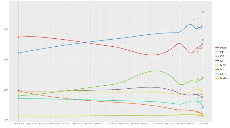 - ↑ "ElectoPanel Islas Baleares / El PSOE sube y tiene posibilidades de mantener el gobierno". El Plural (in Spanish). 8 April 2023.
