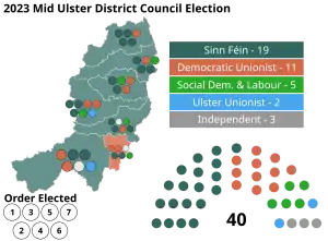 The 2023 election to Mid Ulster District Council was scheduled and held on 18 May 2023, alongside other local elections in Northern Ireland, two weeks after local elections in England.[1] The Northern Ireland elections were delayed by 2 weeks to avoid overlapping with the coronation of King Charles III.[2]