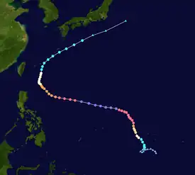 On May 17, a weak LLCC located 865 km (535 mi) south of Guam was marked by the JTWC.[33] Thunderstorms around the LLCC soon became very wide and organization had improved,[34] before the JMA upgraded the system to a tropical depression on May 19.[35] JTWC later designated the depression as 02W.[36] The same day, the depression became a tropical storm, receiving the name Mawar.[37] The JMA further upgraded the storm to severe tropical storm status at 00:00 UTC of May 21,[38] as the deep convection in the central dense overcast (CDO) completely obscured the LLCC.[39] Mawar later became a typhoon on the same day.[40] Mawar further became a super typhoon and underwent an eyewall replacement cycle.[41][42] During May 24, the center of Mawar passed through the northern tip of Guam, and slightly weakened.[43] After passing north of and impacting Guam, Mawar later restrengthen and became a Category 5-equivalent super typhoon, attaining 1-minute sustained winds of 295 km/h (185 mph).[44] It then entered PAR, which PAGASA assigned the local name Betty.[45] Mawar slightly weakened moving around the southwestern edge of the subtropical high, with JMA downgraded the system into severe tropical storm status.[46] Mawar further downgraded into a tropical storm as it approached Okinawa.[47] On June 3, Mawar transitioned into an extratropical cyclone south of Honshu, as it moved towards the open Pacific.[48]
