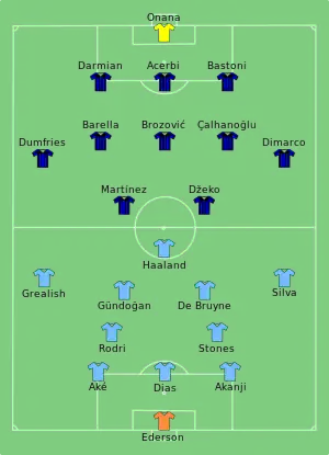 Manchester City began the final with Kyle Walker on the bench and replaced by Nathan Aké in the starting line-up in an unexpected change; Inter Milan retained the same starting line-up that had played in previous rounds.[56] The two sides had scoring chances early in the first half, but Inter's André Onana made two saves to prevent City from taking the lead.[57] A misplayed pass from Ederson in the 26th minute was stolen by Nicolò Barella, but his shot over the goalkeeper missed.[58][59] Kevin De Bruyne left the match in the 36th minute with a hamstring injury and was replaced by Phil Foden.[60] The first half ended scoreless, with Inter playing defensively to prevent City from gaining momentum.[57][59]