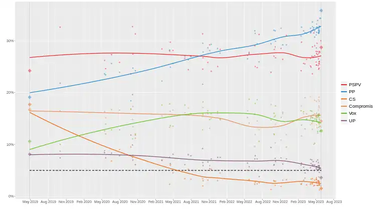 - 1 2 "Una encuesta del PSPV da la mayor intención de voto a Puig, casi cuatro puntos por encima del PP". Levante-EMV (in Spanish). 21 April 2023.