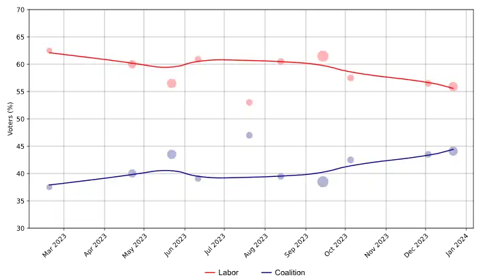 | 3 December 2023 | Resolve Strategic[10][lower-alpha 6] | ~1,100 | 37% | 31%* | 11% | 20% | 56.5% | 43.5% | ||