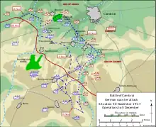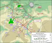 On 1 October the division (less the artillery) entrained for Bapaume, and by 10 October had relieved the 40th Division with all three brigades in the line from Villers Plouich to Villers Guislains about 1.5 miles (2.4 km) north to south-east of Gouzeaucourt. The 11th D.L.I. (pioneers) was ordered to send 200 men to strengthen the infantry after the Ypres battles, and received lower fitness men in return.[62] Now part of III Corps of the Third Army, the division had a quiet time in the line and was rejoined by its artillery on 25 October.[63] On 29 October the division line was shortened when the 55th (West Lancashire) Division took over the southern third of the line around Villers Guislains. Brigade commanders and staffs were informed of the plan of attack early in November, other brigade officers only a week before the attack.[64]