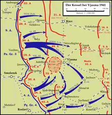On July 29 the STAVKA ordered Kachalov to bring the 21st Mountain Cavalry and 52nd Cavalry Divisions forward from the Army reserve to protect his left flank west of Roslavl and reorganize to renew his attacks. At the same time Army Group Center was planning to eliminate Group Kachalov with its XXIV Panzer Corps. At this time Roslavl was 65km beyond the German front lines.[5] As of August 1 the 222nd had been reassigned to Reserve Front's 43rd Army, joining the 217th and 53rd Rifle Divisions.[6] The German attack began the same day and quickly broke through Kachalov's left flank before wheeling east along the Roslavl road, led by 4th Panzer Division. The assault overran the two cavalry divisions, splitting them apart and forcing them to with withdraw in disorder before turning the 222nd's left flank. The panzers were joined by infantry of VII Army Corps advancing on the city from the west and the division was effectively routed. Somewhat late, Kachalov ordered antitank reinforcements to the sector, but the end of August 2 4th Panzer was within 15km of the western outskirts of Roslavl. In spite of this threat, under pressure from the STAVKA Kachalov continued to order attacks to the north, which were effectively suicidal under the circumstances.[7]