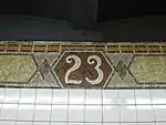Both platforms have their original mosaic trim line and name tablets of a predominately brown and red color along with yellow and olive green. Except for at either end of the platforms where it gets narrower, both also have maroon I-beam columns running along them at regular intervals, alternating ones having the standard black station name plate with white lettering.