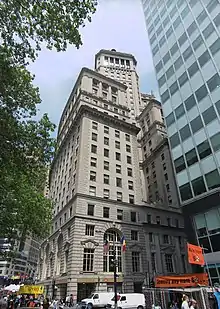 The modern building's facade is primarily composed of buff-colored Indiana Limestone, covering the tower and much of the base. The limestone facade at the lowest four stories is rusticated.[19][16] The original building's facade was made of red brick and granite, making it appear as though the original section was separate from the expanded structure.[21] Part of this facade is visible from New Street, but the Broadway facade was totally replaced with limestone.[17][22][20] A small portion of the original building's southern facade is still visible but was given a limestone overlay.[19]