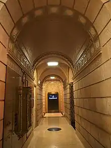 The entrance hall is 40 feet (12 m) high.[17][20][33] It is finished with pink marble and contains pairs of Corinthian marble pilasters, carrying a marble cornice with the names of Standard Oil's cofounders. Above the cornice is a beamed ceiling and decorative panels with signs of the zodiac. In addition, the floors are clad in travertine and black marble, and the walls have bronze grilles.[34][14] Lighting fixtures, doors, and gates are also made of wrought iron with bronze ornamentation.[14] The use of columns, pilasters, rusticated walls, and heavy staircases and doorways was intended to create the effect of "a princely palace or merchant's mansion".[35]