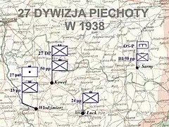The 27 Infantry Division (Polish: 27 Dywizja Piechoty), was a unit of the Polish Army in the inter-war period. It was created on 18 October 1920, as a result of reorganization of the Army, from units of the 2nd I.D., 3rd I.D., and 13th I.D. Its headquarters were located in Kowel, with units stationed in other Volhynian towns, such as Lutsk, Sarny and Wlodzimierz Wolynski. Division's first commandant was General Gustaw Kuchinka.