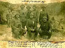 Officers of the 27th Regiment. Left to right. Front row: Major Kör Halis (Ataksor), commander of the 27th Regiment Colonel Şefik (Aker), commander of the 1st battalion Major Cemil. Back row: commander of the 2nd battalion Captain Mustafa, commander of the 3rd battalion Faik, commander of the machine gun company Captain Hamdi, aide-de-camps Cevdet.