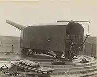 Some of the 28 cm SK L/40 guns were transferred to the German Army from the Navy (Kaiserliche Marine) when the pre-dreadnoughts began to be disarmed and relegated to training duties in 1916 after the Battle of Jutland had proved that they were not suitable for contemporary naval combat. One obvious change made for land service was the placement of a large counterweight just forward of the trunnions to counteract the preponderance of weight towards the breech. This, although heavy, was simpler than adding equilibrators to perform the same function. It was fitted with a hydro-pneumatic system to absorb the recoil from firing and to return the gun to its firing position, ready for the next round. The first four guns were placed in Bettungsschiessgerüst (firing platform) (BSG) mountings in 1917 for coast defense duties as part of "Batterie Graf Spee" on the island of Wangerooge. These were a semi-portable mount that could be emplaced anywhere after several weeks of labor to prepare the position. It rotated on a pivot at the front of the mount and the rear was supported by rollers resting on a semicircular rail and was sometimes equipped with a gun shield.[3] The gun's rate of fire in these mounts was about one round per five minutes.[4]