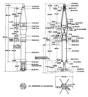 The PG-15V HEAT round weighs 3.47 kilograms (7 lb 10 oz) and uses a 2.6 kg (5 lb 12 oz) PG-9 shell with a 0.322 kg (11.4 oz) RDX explosive charge in the warhead.[3][4] A small PG-15P powder charge is used to boost the projectile from the gun barrel at 400 metres per second (1,300 ft/s). Once the projectile has travelled 10–20 m (33–66 ft), the rocket motor starts and accelerates it to 700 m/s (2,300 ft/s).